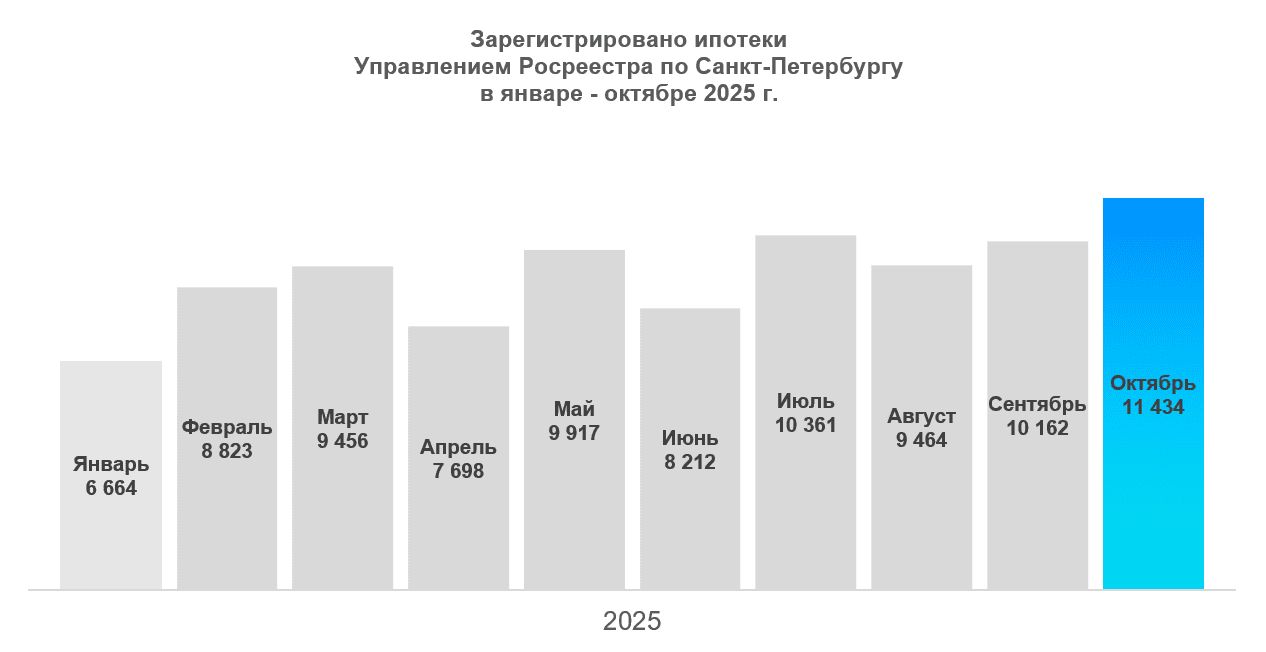 Ипотеки в октябре зарегистрировано – 11 434, что стало новым годовым максимумом. С начала года ипотеки зарегистрировано 92 192.