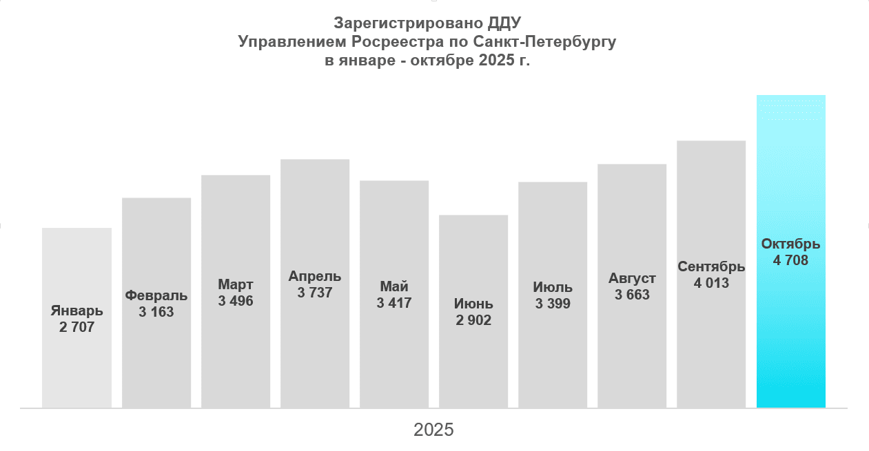 Общее количество зарегистрированных в октябре 2025 года договоров участия в долевом строительстве – 4 708, что стало годовым максимумом. Всего за 10 месяцев зарегистрировано 35 205 ДДУ.