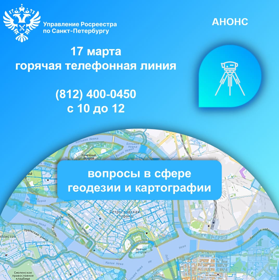 17 марта 2026 года с 10.00 до 12.00 часов Управление Росреестра по Санкт-Петербургу проводит горячую телефонную линию по вопросам в сфере геодезии и картографии.