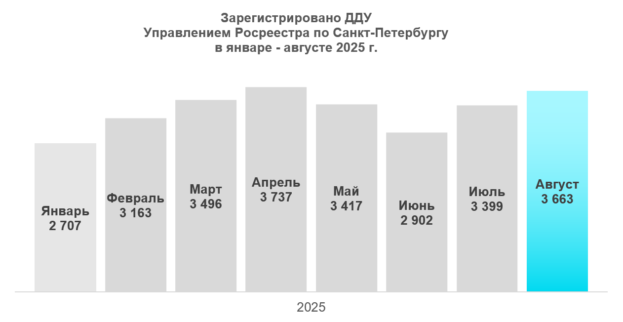 Общее количество зарегистрированных в августе 2025 года договоров участия в долевом строительстве – 3 663, всего за 8 месяцев зарегистрировано 26 484.