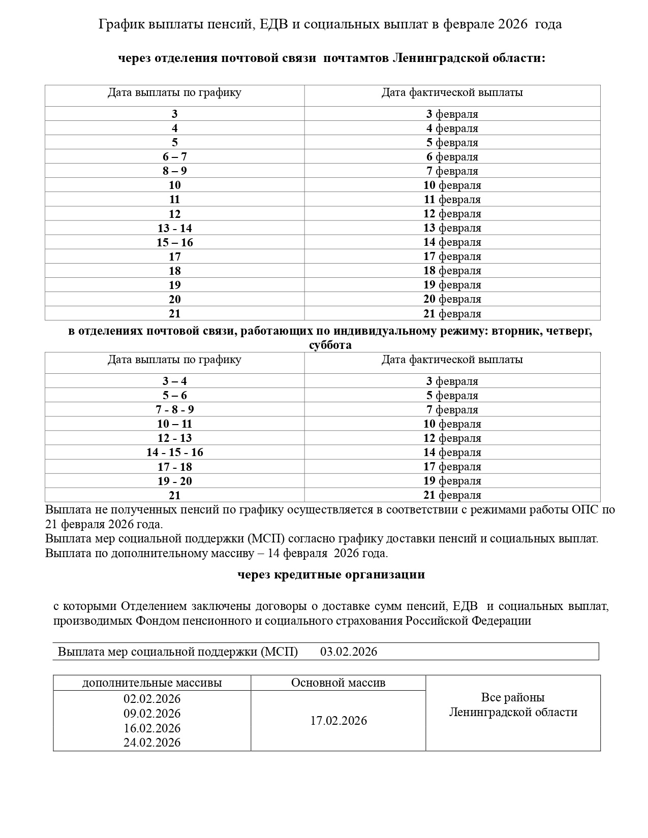График выплаты пенсий, ЕДВ и социальных выплат в феврале 2026 года (Ленинградская область)