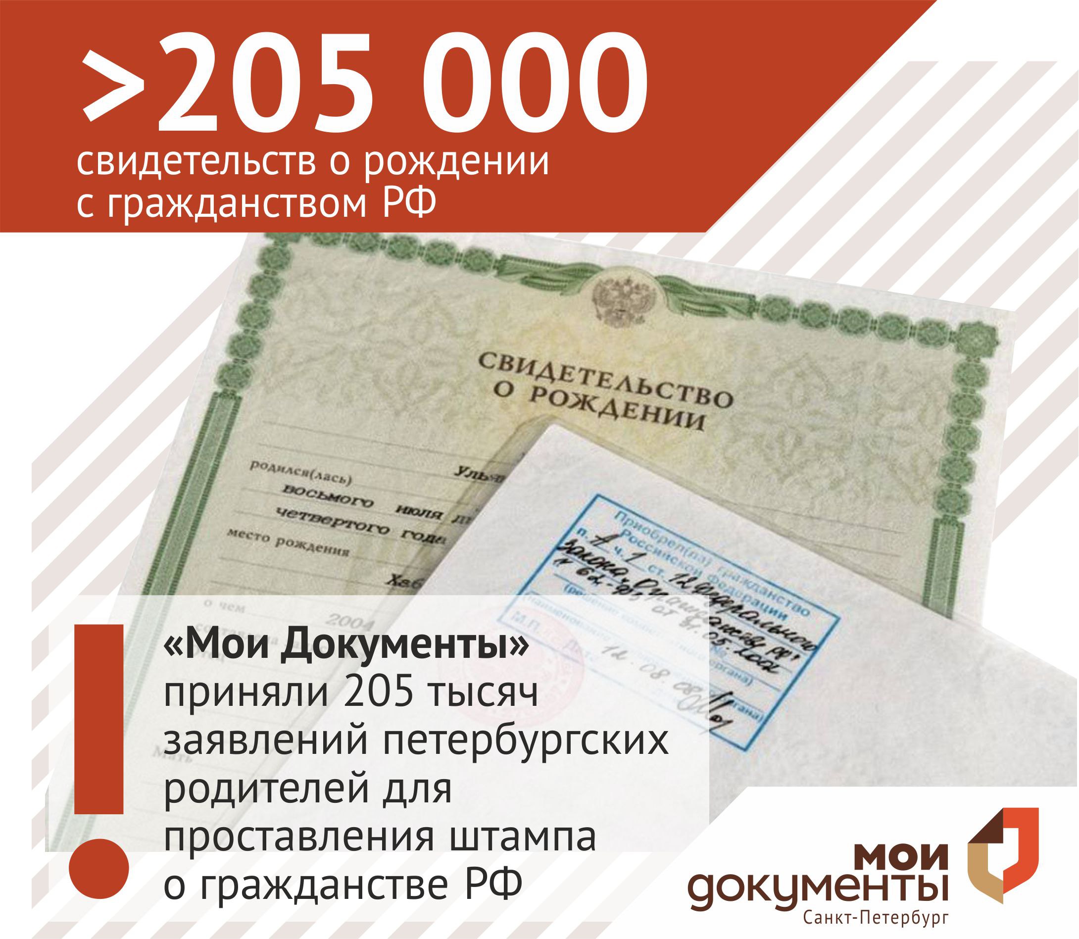 За полтора года центры госуслуг «Мои Документы» приняли 205 тысяч заявлений петербургских родителей для проставления штампа о гражданстве РФ на свидетельства о рождении детей. Губернатор Санкт-Петербурга Александр Беглов лично анонсировал старт сервиса в июне 2024 года. До этого получить штамп о гражданстве можно было только в подразделениях МВД России. Сегодня услуга предоставляется в 63 МФЦ, а также в Мобильных офисах госуслуг.