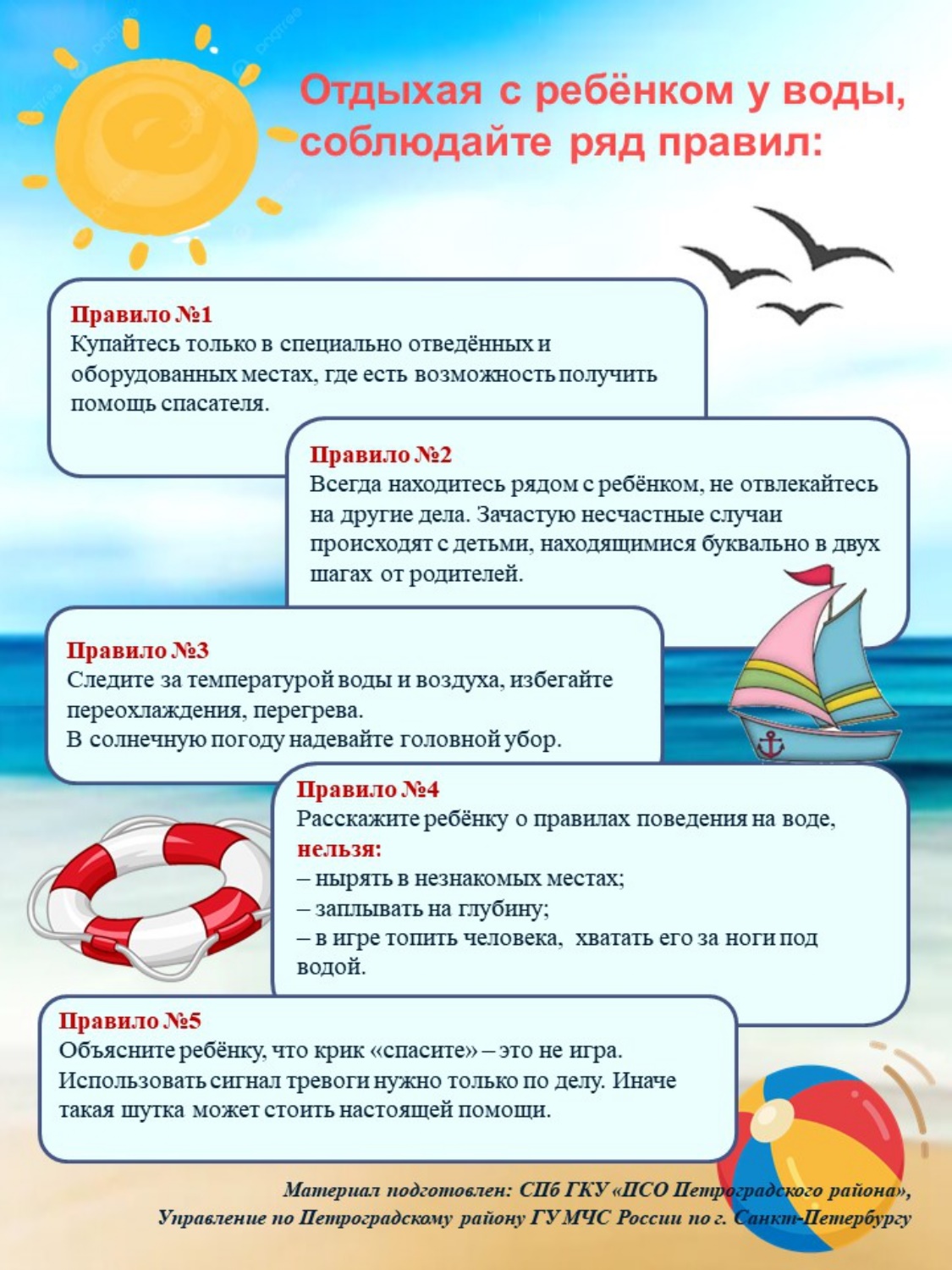 СПб ГКУ «ПСО Петроградского района» и Управление по Петроградскому району ГУ МЧС России по г. Санкт‑Петербургу напоминают о необходимости соблюдения ряда правил, которые сделают ваш отдых с ребёнком безопасным.