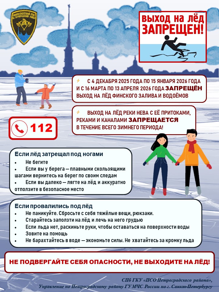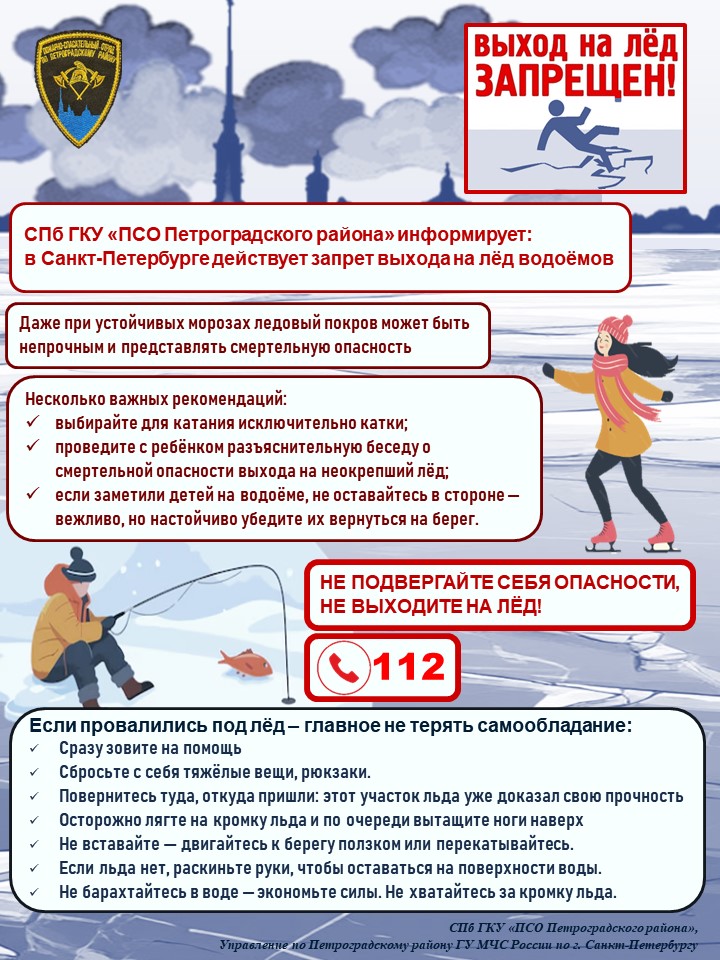 СПб ГКУ ПСО Петроградского района напоминает, что в соответствии с постановлением правительства Санкт‑Петербурга от 03.11.2023 № 1165 с 15 ноября 2023 по 15 апреля 2024 выход на лёд в Санкт‑Петербурге запрещён. За нарушение предусмотрена административная ответственность – штраф от 1 тыс. до 5 тыс. рублей.