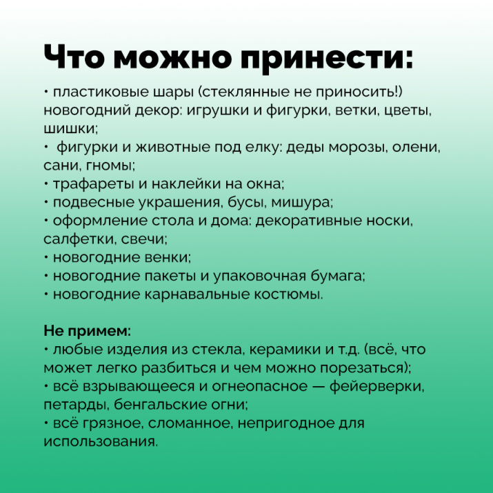 Приносить на акцию можно небьющиеся предметы: пластиковые шары, бусы, свечи, статуэтки, упаковочную бумагу — всё, что относится к новогодней тематике.