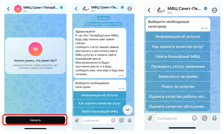 - Нажмите «Начать» чтобы начать общение с чат-ботом. Выберите необходимую категорию и совершите любое действие в чат-боте. Посредством чат-бота Вы можете узнать информацию о популярных услугах, о графике работы МФЦ и найти ближайший к Вам, проверить статус заявления, записаться на прием, а также оценить качество обслуживания.