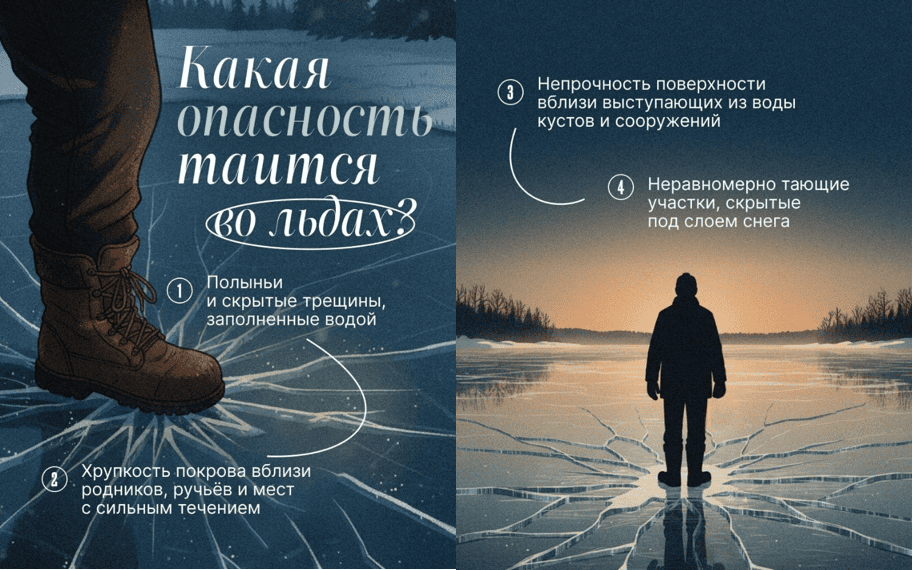Выход на тонкий лёд представляет серьёзную угрозу для жизни и здоровья человека и ежегодно становится причиной несчастных случаев на водоёмах. В период неустойчивых температур ледяной покров формируется неравномерно: особенно опасными являются участки вблизи берегов, мостов, мест с течением, впадения ручьёв и сточных вод. Визуально прочный лёд может не выдержать веса человека, что приводит к внезапному провалу в холодную воду. Переохлаждение организма происходит стремительно и может вызвать потерю сознания уже через несколько минут. Особую опасность выход на лёд представляет для детей и рыбаков, пренебрегающих мерами безопасности. Запрещается выходить на лёд в тёмное время суток, при плохой видимости, а также в период оттепели. Родителям необходимо разъяснять детям правила поведения у водоёмов и не оставлять их без присмотра. Соблюдение элементарных мер предосторожности и отказ от выхода на тонкий лёд позволяют предотвратить трагедии и сохранить человеческие жизни.